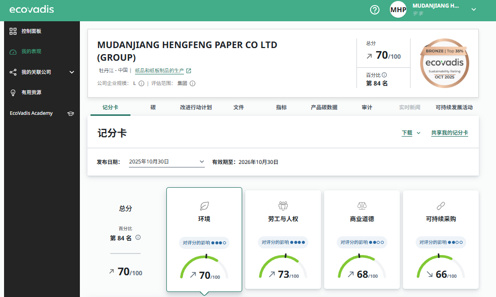 2025年10月30日,EcoVadis發(fā)布了恒豐紙業(yè)2025年度評級結(jié)果,本次評級分數(shù)為70/100,百分比排名16%,再次榮獲銅牌獎,碳管理水平被評為領(lǐng)先者,充分體現(xiàn)了公司在可持續(xù)發(fā)展方面的優(yōu)秀表現(xiàn)。